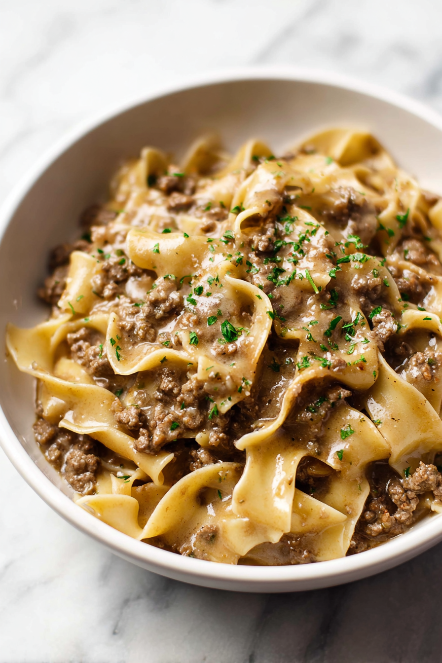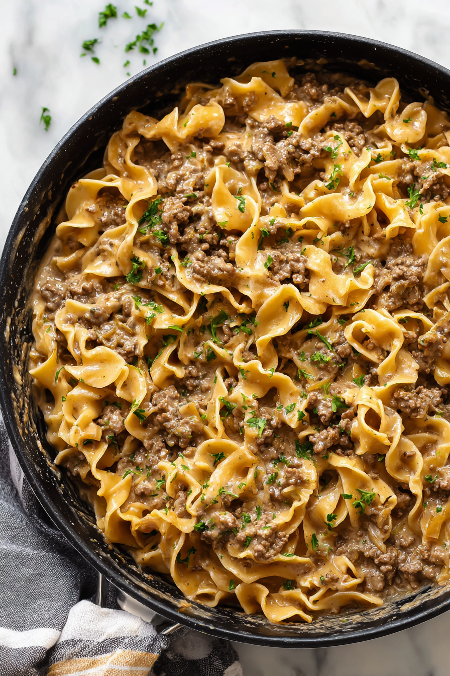 Cook them just to al dente — no more! Egg noodles soften quickly, and they continue absorbing sauce once mixed in. Drain them right away, toss with the beef mixture, and you’ll be rewarded with perfectly tender (not soggy!) noodles.