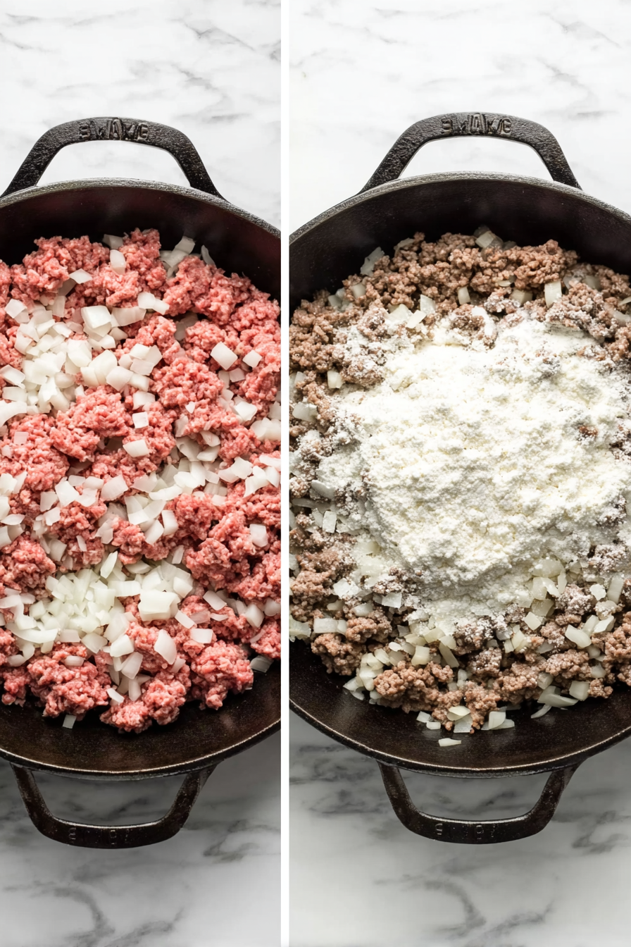 - Sprinkle the flour over the beef mixture and stir for 1–2 minutes. This step helps the gravy thicken without a raw flour taste.