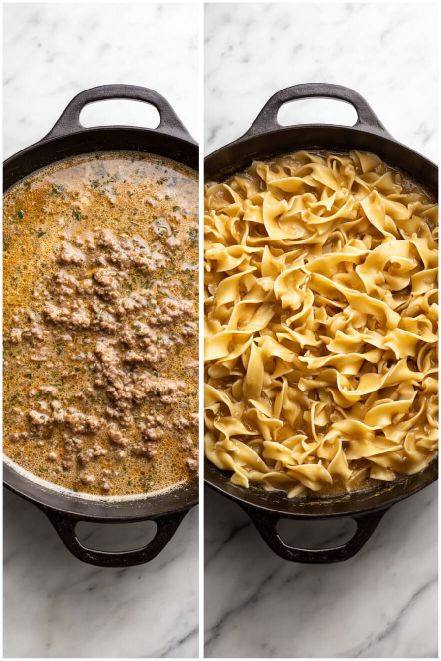 If it thickens too much, add a splash more broth. - Drain the noodles once cooked. Add them directly into the skillet and toss to coat them in the beef gravy. Taste and season with salt and pepper before serving.