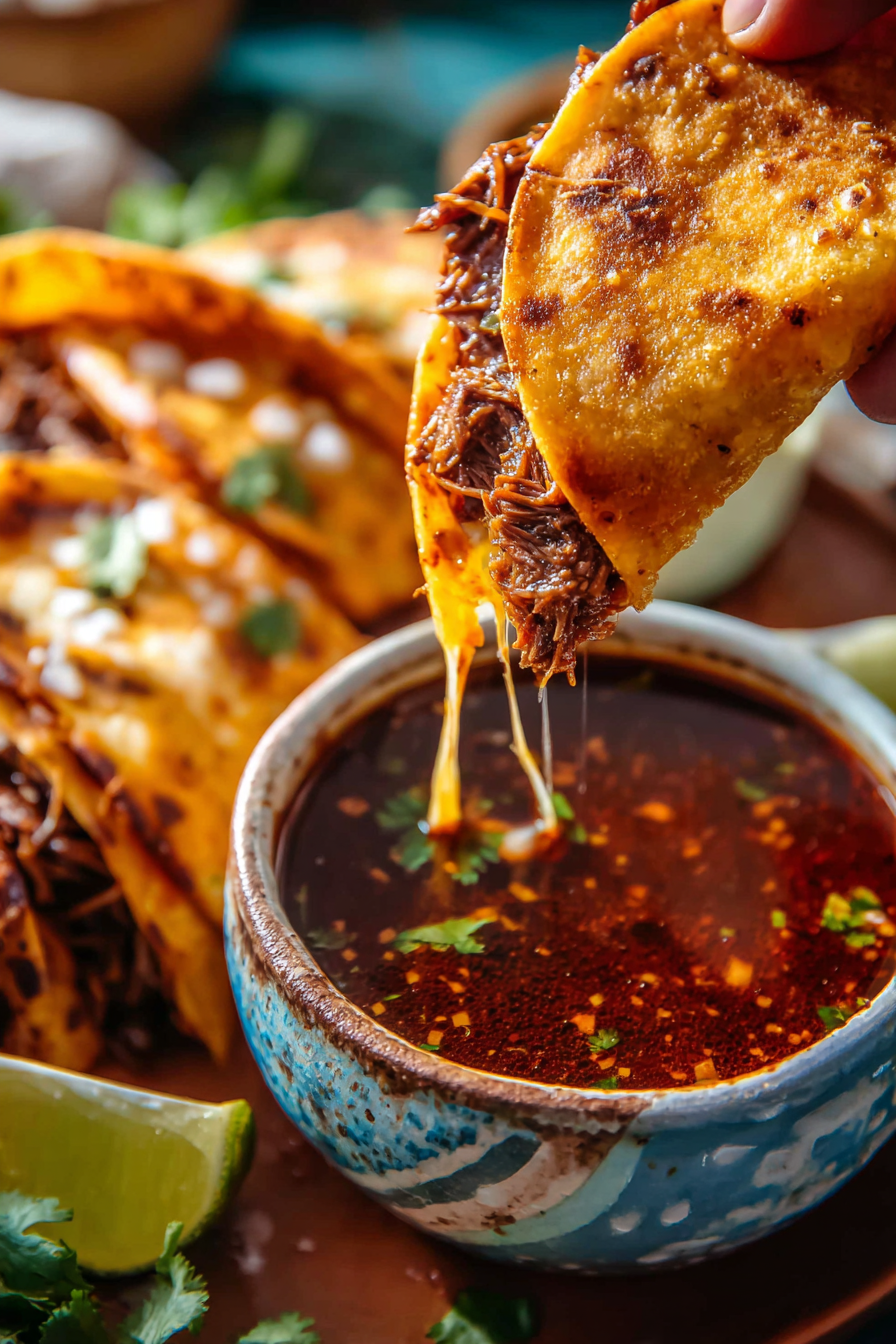 The secret is the fat. Dip the tortillas into the reserved birria fat before frying, cook over medium heat, and don’t overcrowd the pan. Crispy edges, melty cheese, zero sogginess — exactly what we’re after.