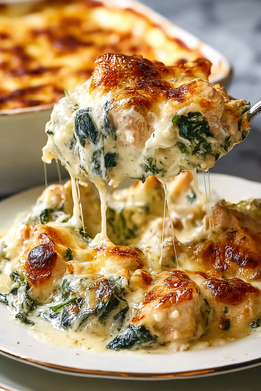 On busy evenings lately, I keep coming back to this creamy chicken and spinach casserole. There’s something deeply comforting about layering tender chicken into a baking dish, folding spinach into a soft cream cheese mixture, and letting the oven do the rest.