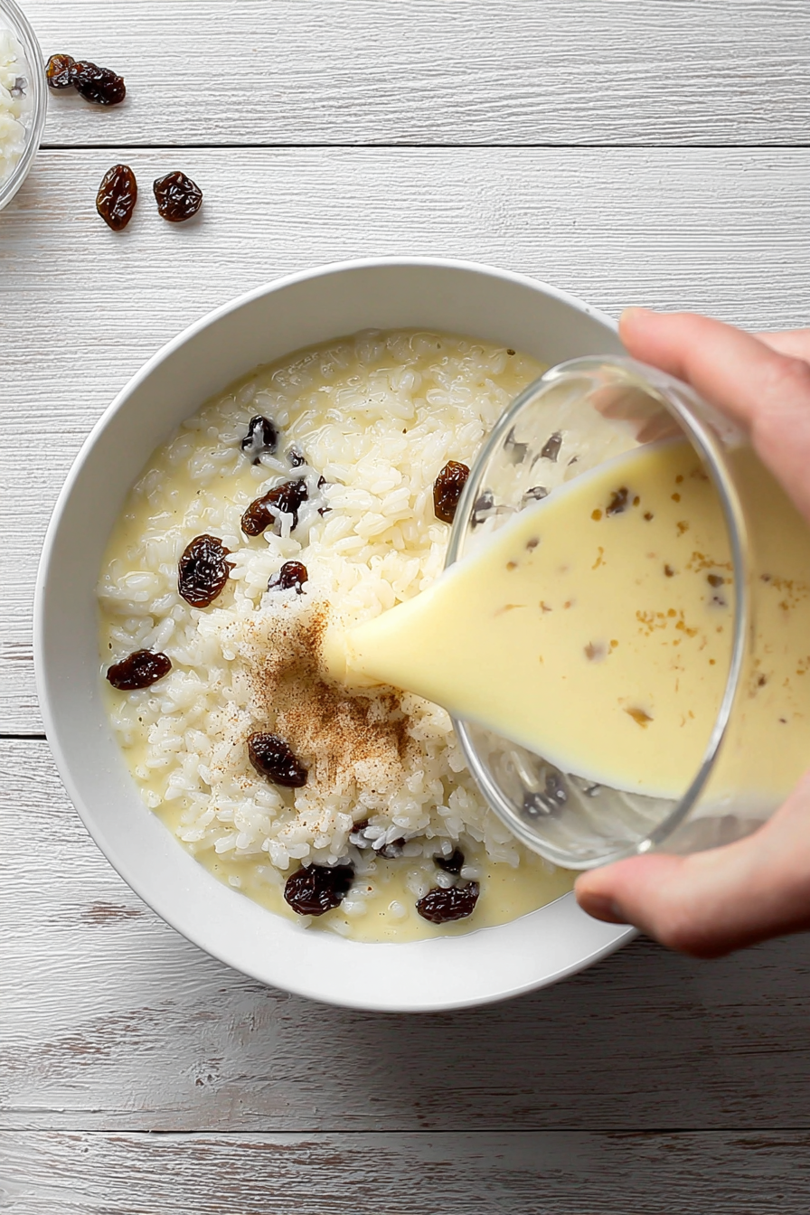 This happens because the custard sets from the outside in. If you prefer a softer, more even texture, you can give it a gentle stir halfway through baking—or loosely cover it with foil for the last 15 minutes. - Should I serve rice pudding warm or cold?