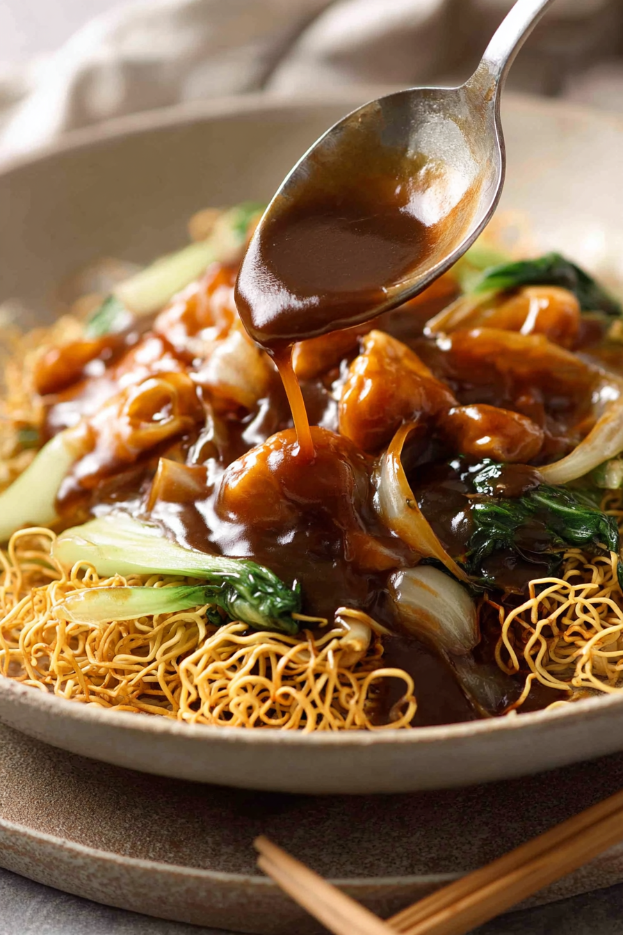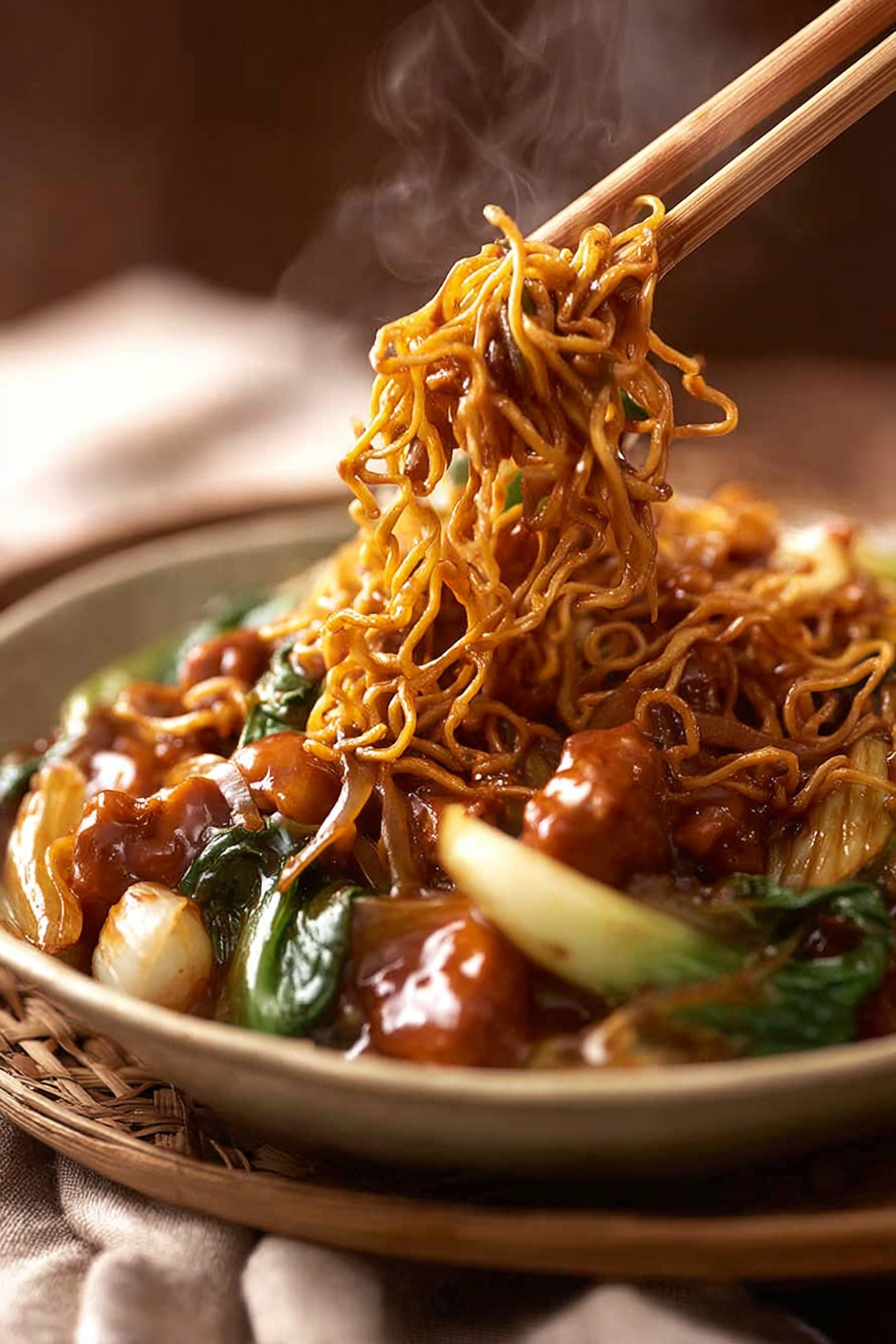 A quick stovetop version of the crunchy noodle dish often found at Chinese restaurants. Instead of deep-frying, the noodles are pan-crisped, giving you the same satisfying texture with far less oil—and a fast, comforting meal ready in about 25 minutes.