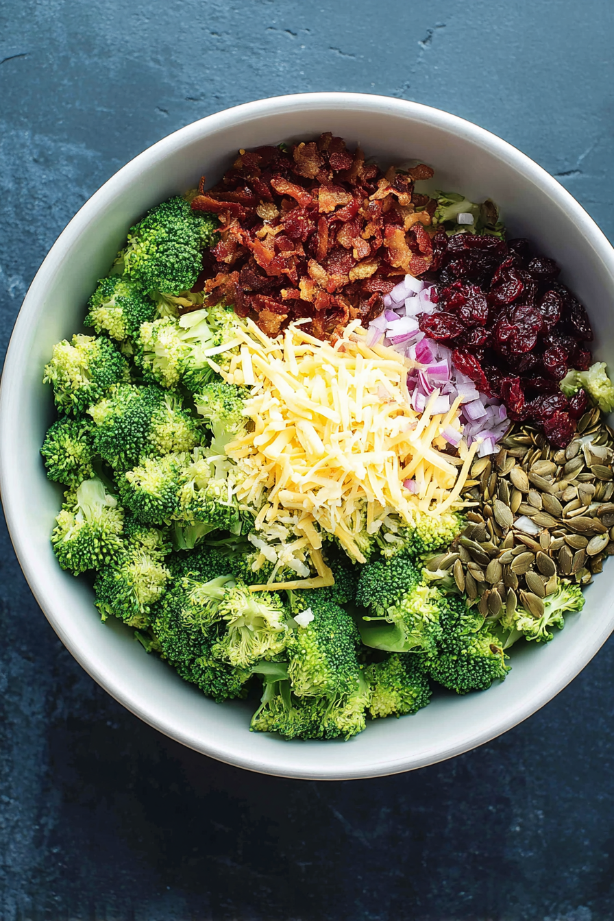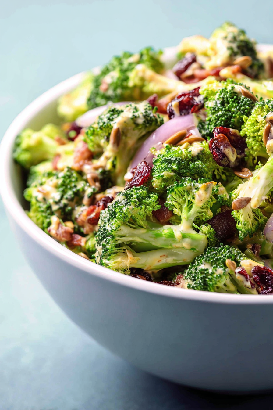This fresh broccoli salad is all about contrast—crisp vegetables, smoky turkey bacon, sweet cranberries, and crunchy seeds—finished with a bright honey mustard dressing made without mayonnaise. It’s quick to assemble and works just as well for weeknight dinners as it does for potlucks.