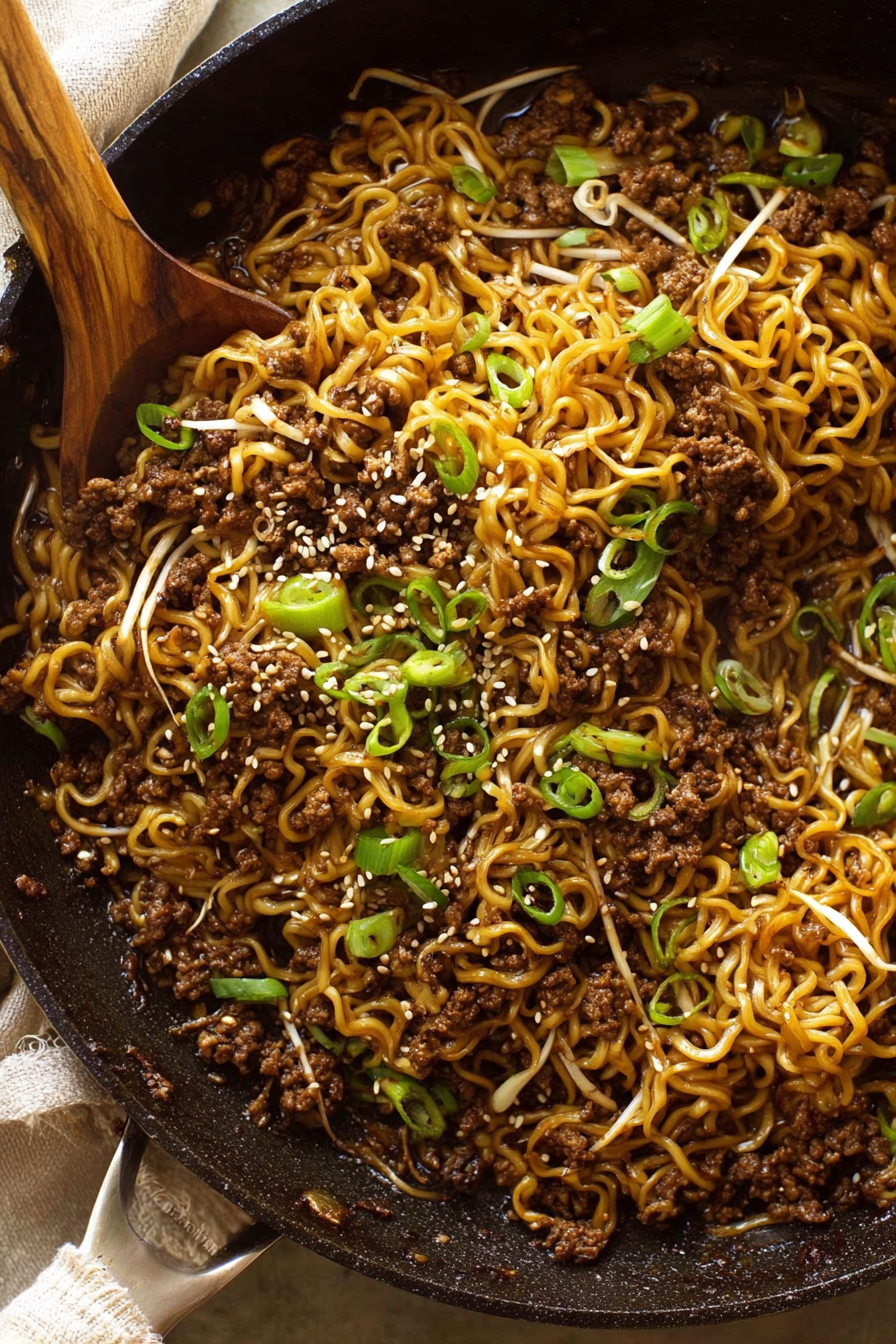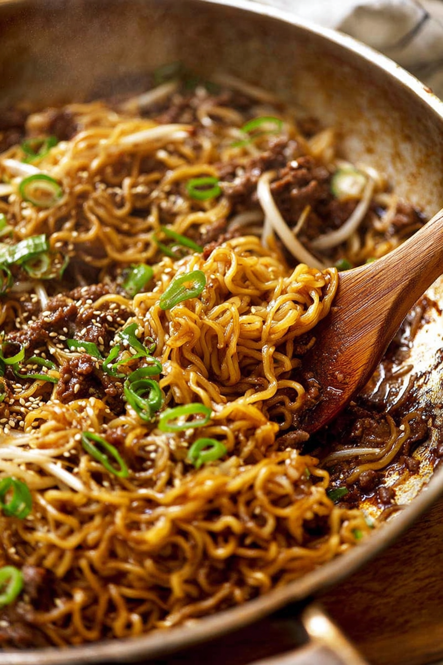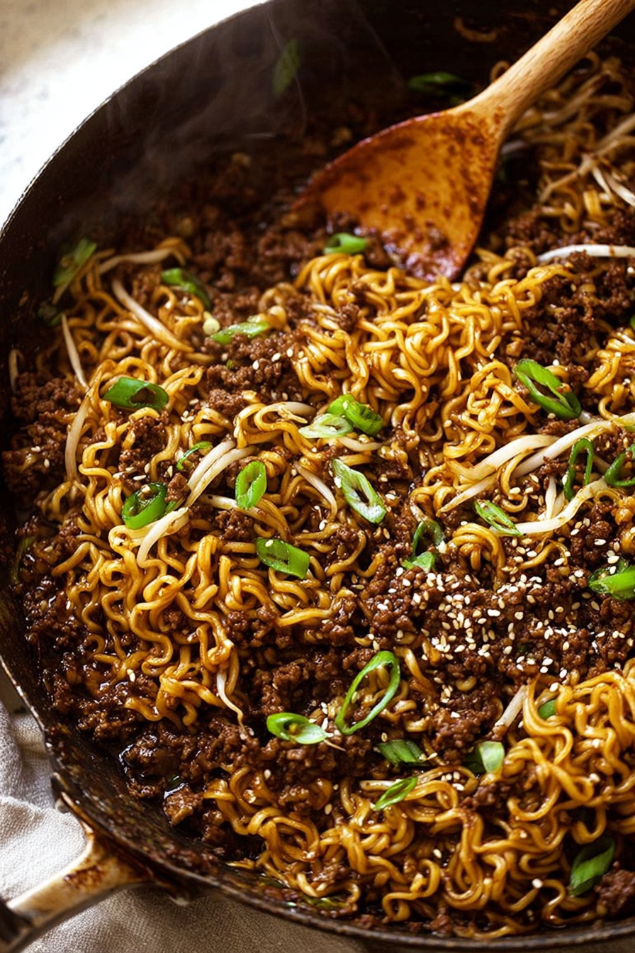 Instant Ramen: Use any instant noodle variety, though very large cakes may need to be broken to fit the pan. If subbing fresh or dried noodles, prepare them separately and use about 2 packed cups; mix them into the caramelized beef with a splash of water.