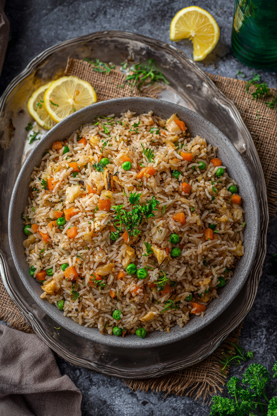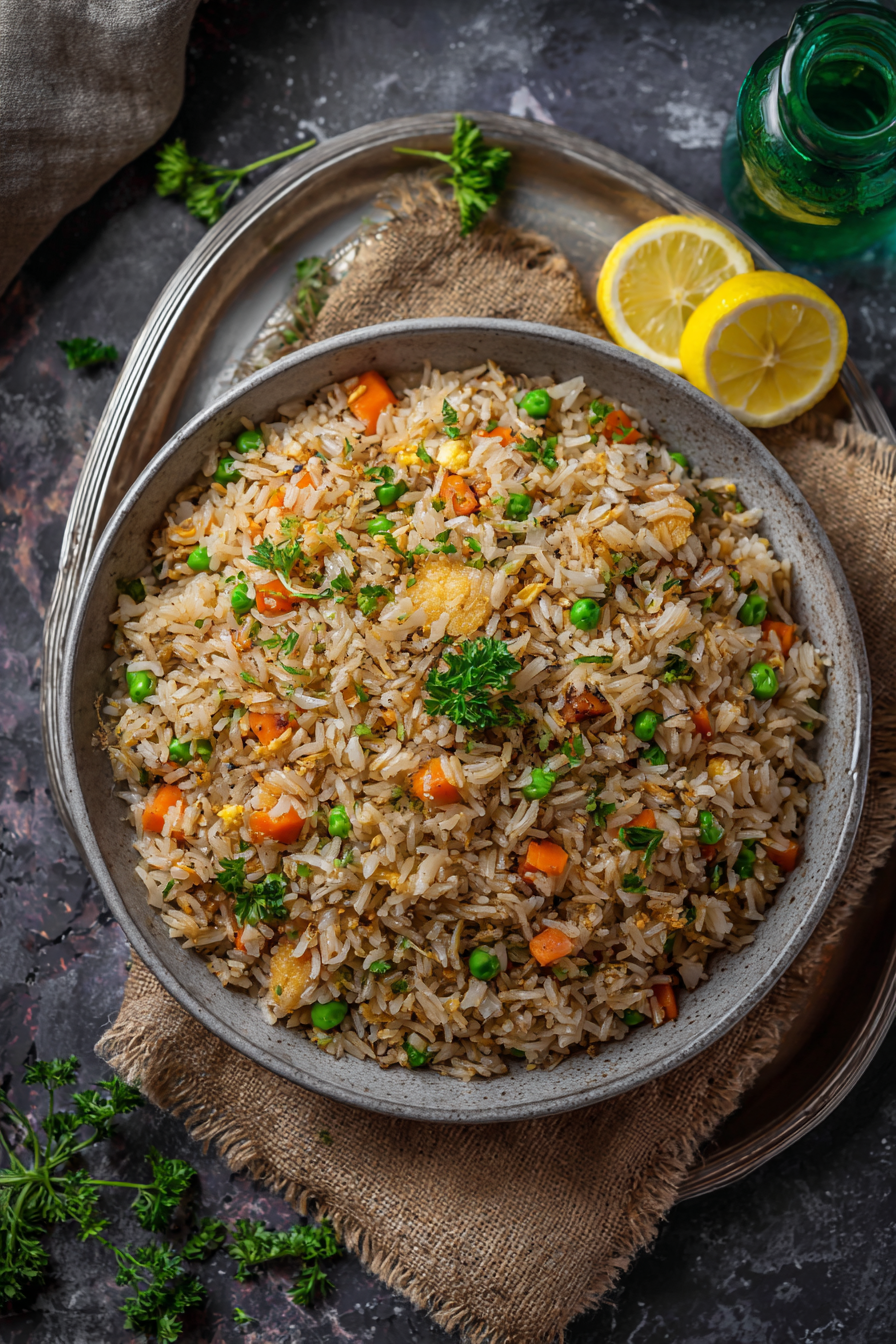- Cooked White Rice – Day-old or fully cooled rice works best, keeping the grains separate and fluffy instead of mushy.