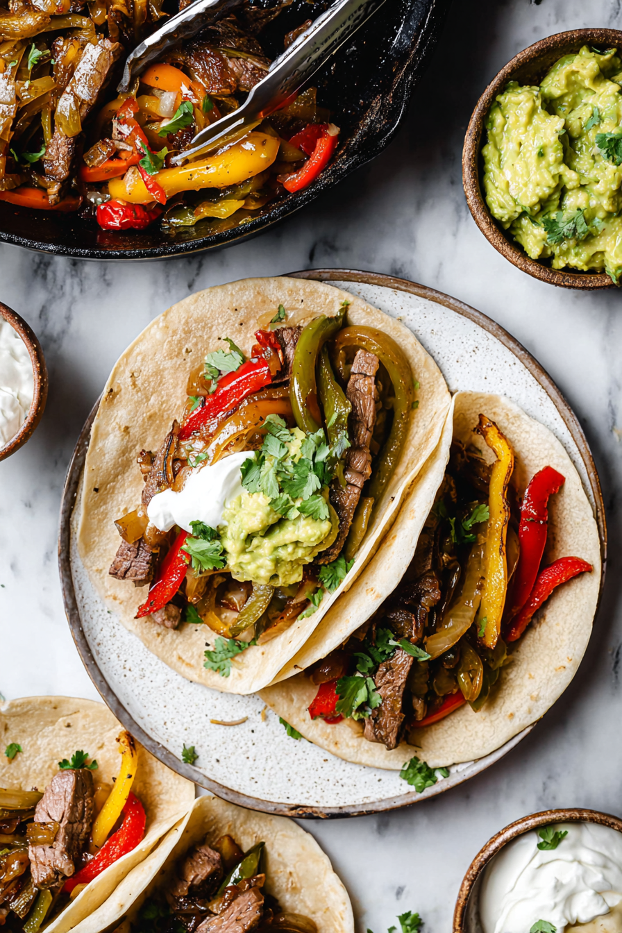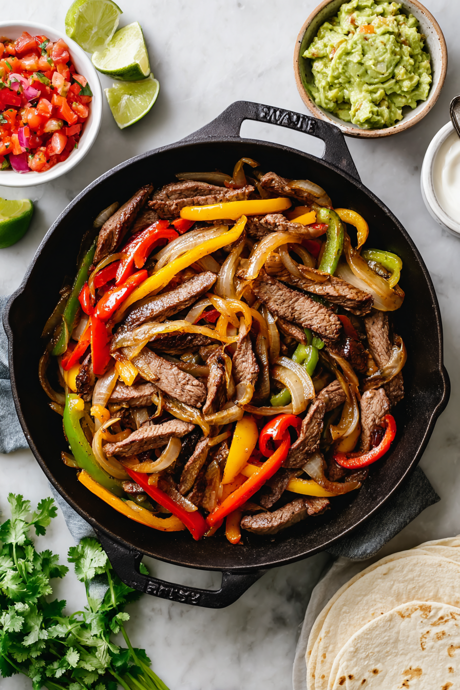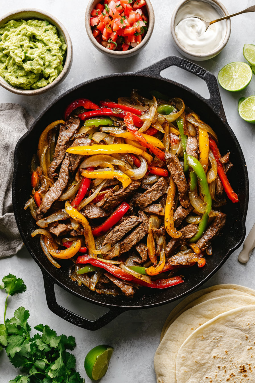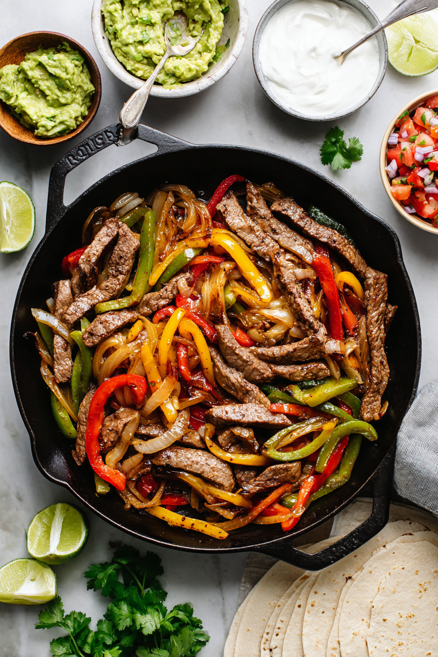 Piled into warm tortillas and topped with whatever you’re craving, these steak fajitas are bold, colorful, and endlessly comforting.