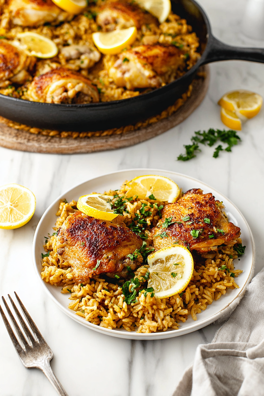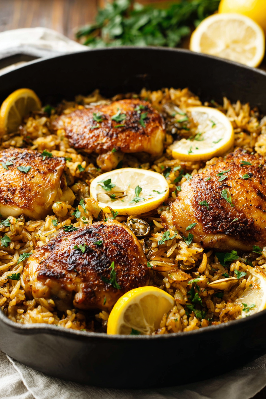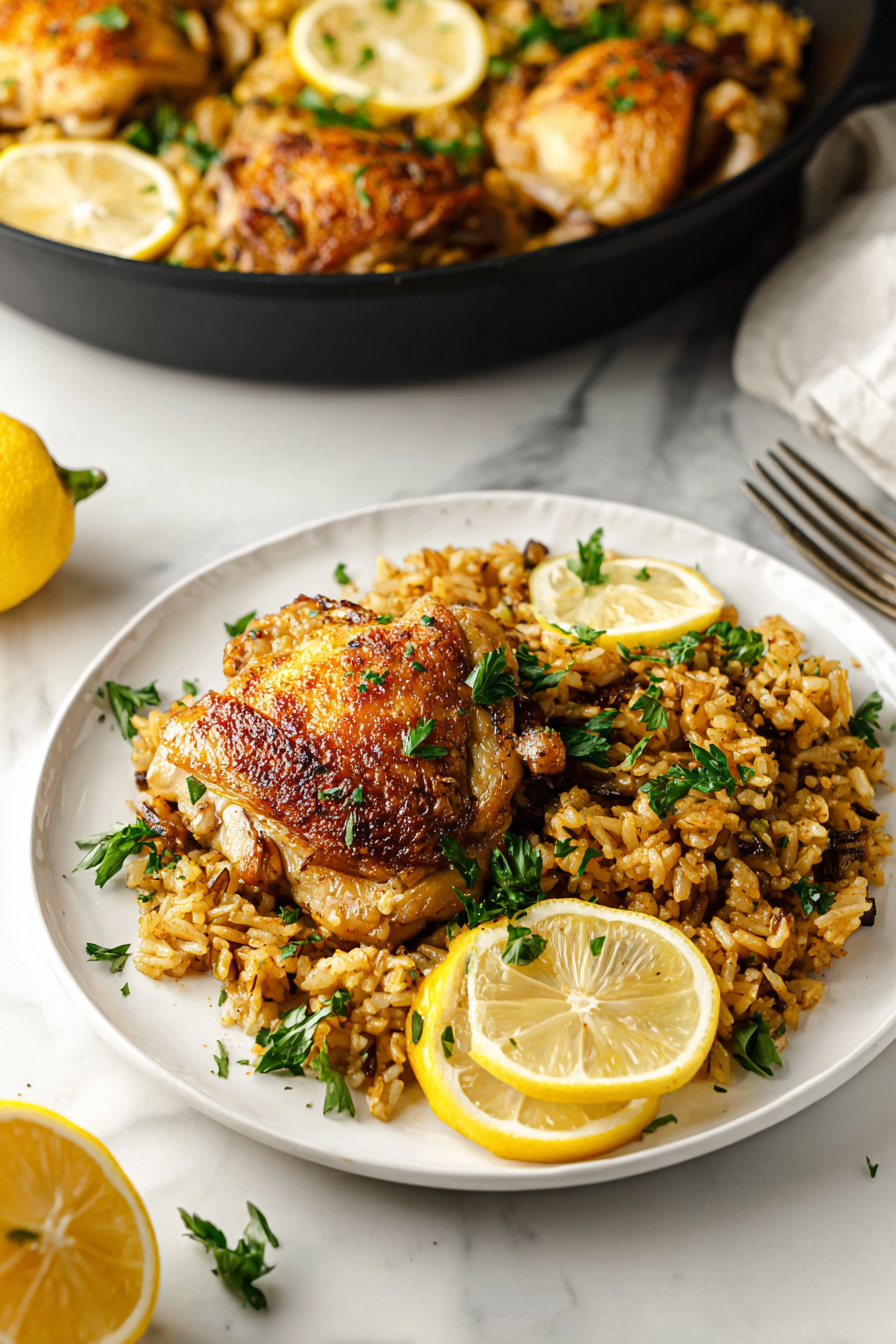 There’s something deeply comforting about searing chicken until the skin turns golden, then stirring rice into a pan fragrant with garlic, herbs, and lemon.