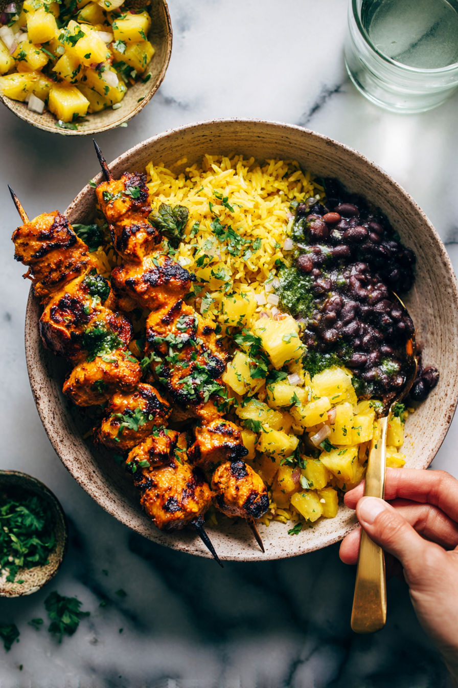- Brush the hot chicken with the remaining sauce. Serve with rice, beans, and your fresh fruit mix.