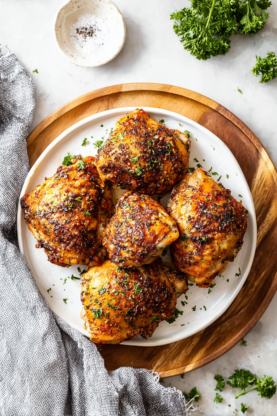 A thermometer is your best friend here. The chicken is ready when the thickest part reaches 165°F (74°C). Baking times can vary depending on thigh size and oven quirks, so don’t rely on the clock alone—check the temp and you’re golden.