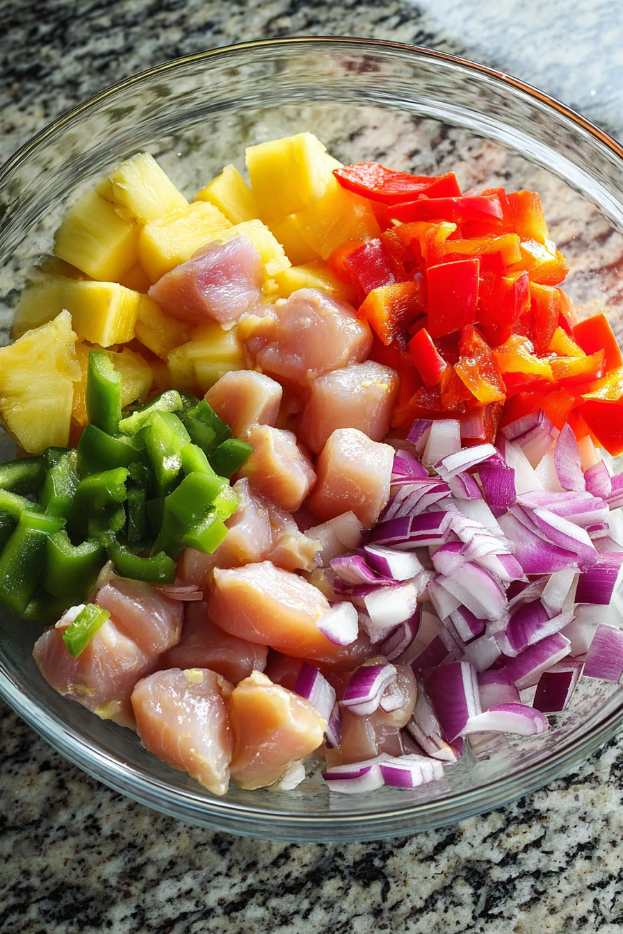 - Place the chicken pieces, chopped vegetables, and pineapple chunks in a large mixing bowl.