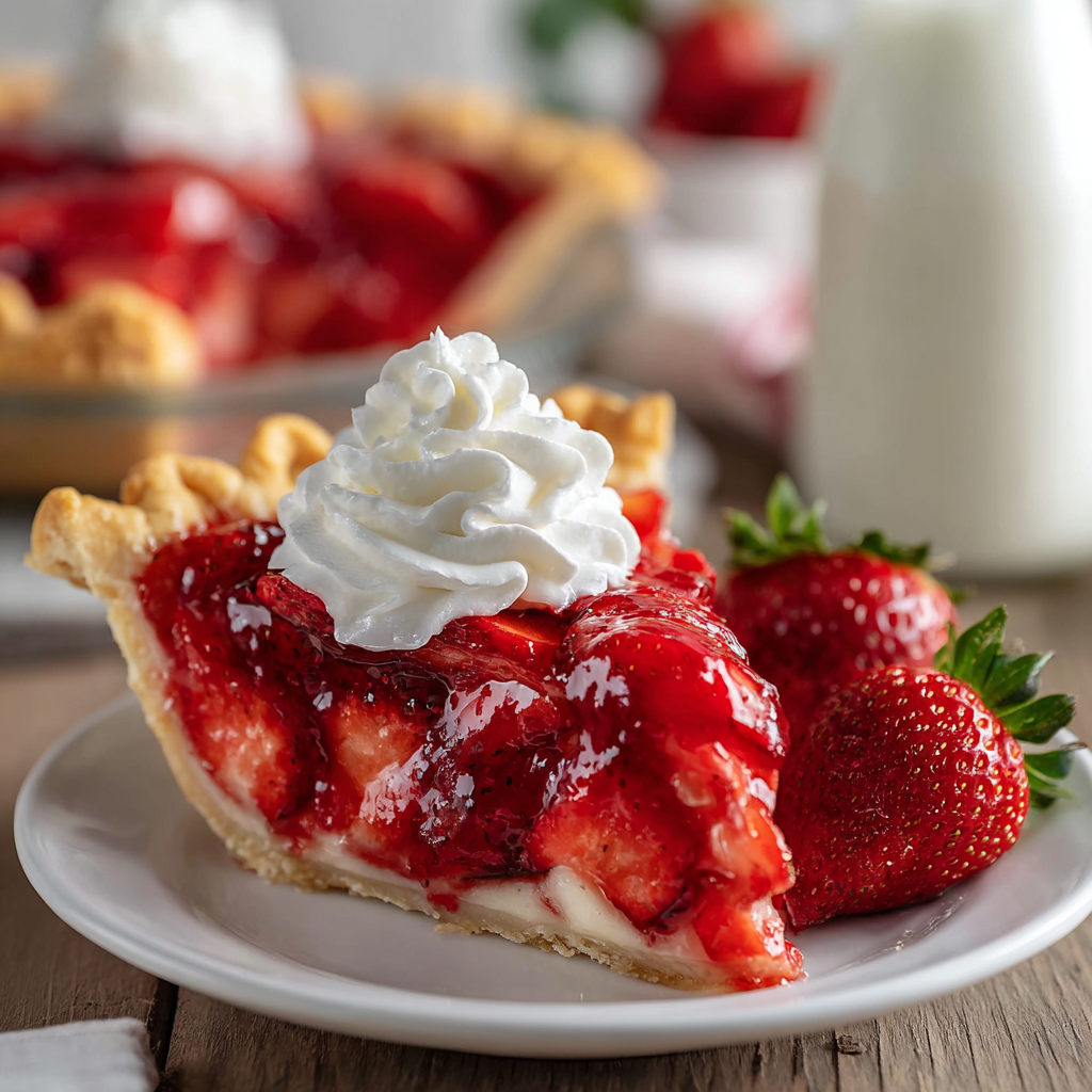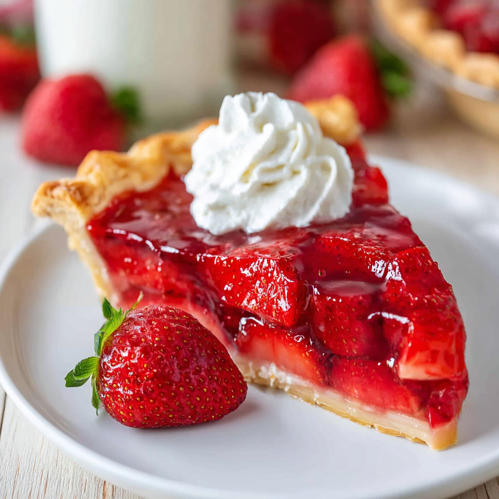 The filling is smooth, glossy, and packed with bright strawberry flavor that pairs perfectly with a flaky crust and a dollop of whipped cream.