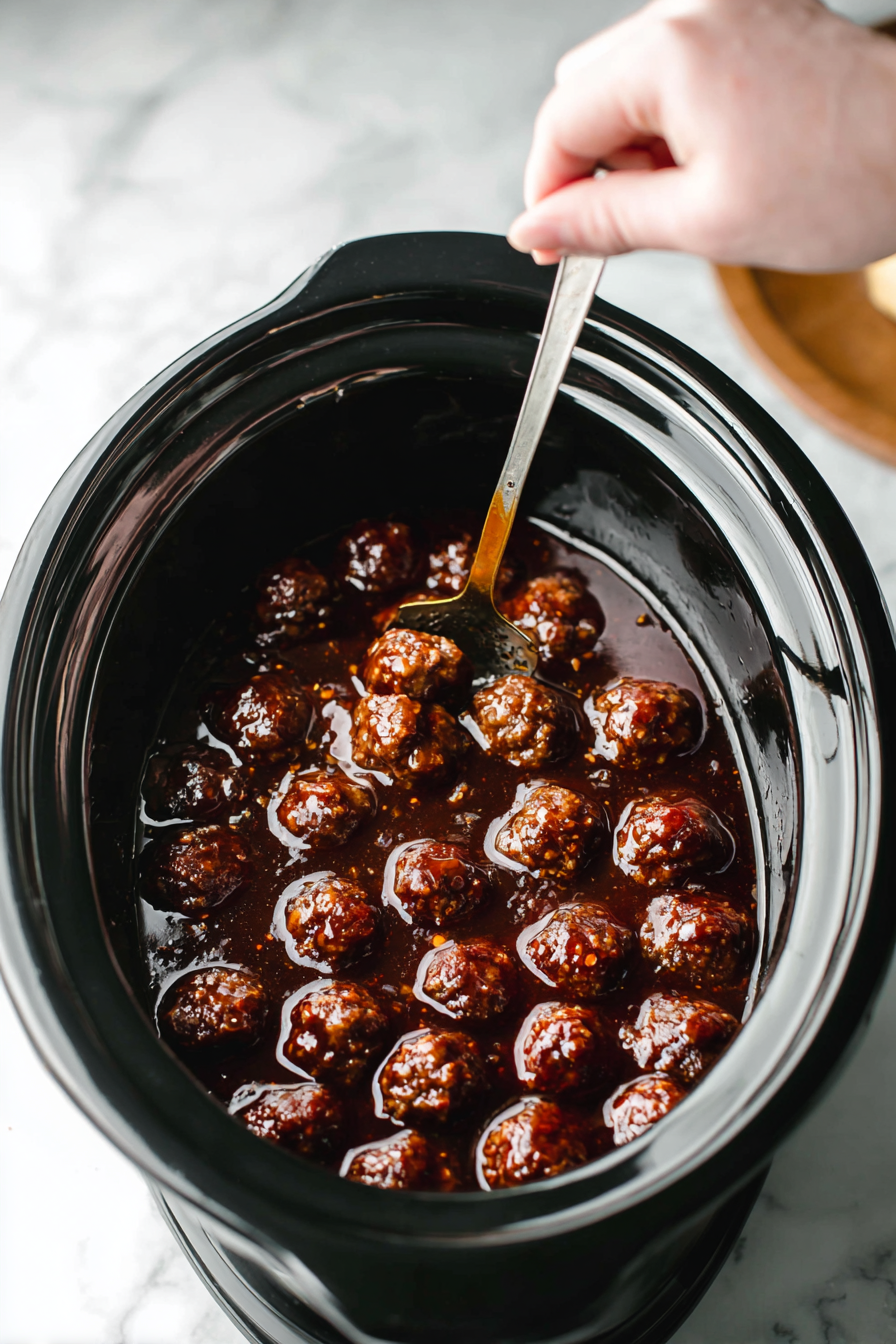 If you’d like a thicker sauce, stir together 1 tablespoon cornstarch with 2 tablespoons cold water and mix it into the crockpot during the last 10–15 minutes of cooking. The sauce will thicken nicely and coat the meatballs beautifully. - Can I make these ahead of time?