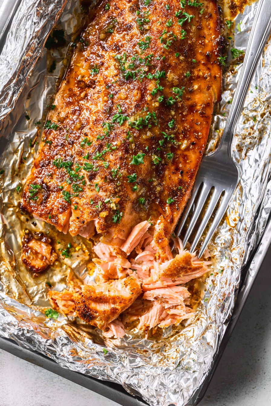 It’s simple, comforting, and deeply flavorful—made with pantry staples, one pan, and just enough time in the oven to turn a whole salmon fillet perfectly tender and flaky.