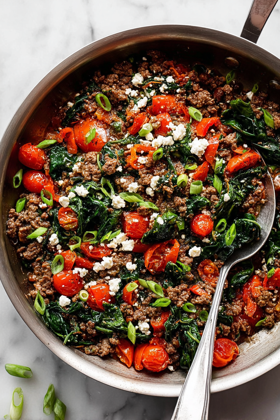 This quick skillet dinner brings together classic Mediterranean ingredients in a simple, satisfying way. Juicy tomatoes, tender spinach, and seasoned ground beef come together in one pan for a fresh, flavorful meal that’s perfect for busy weeknights.