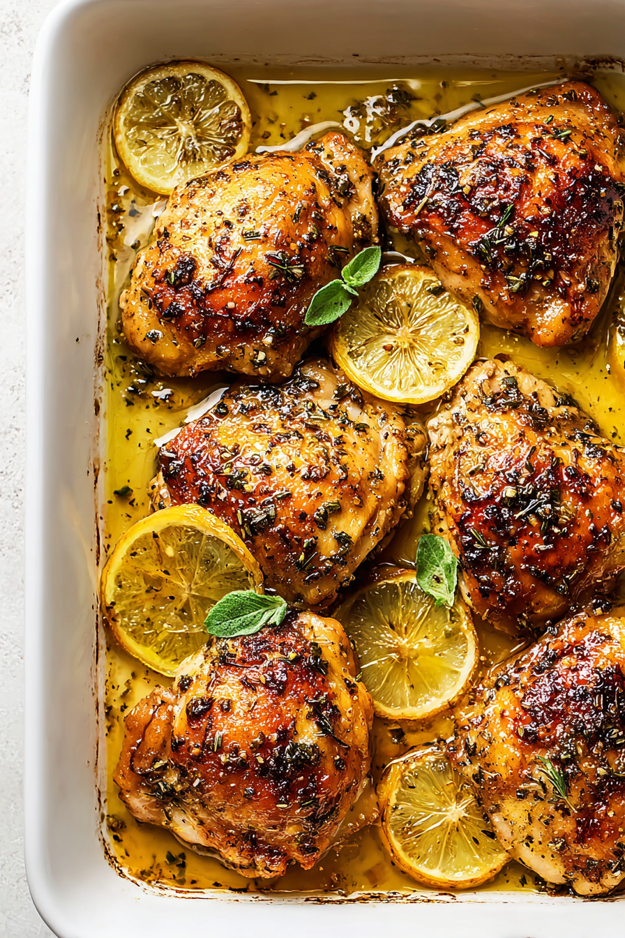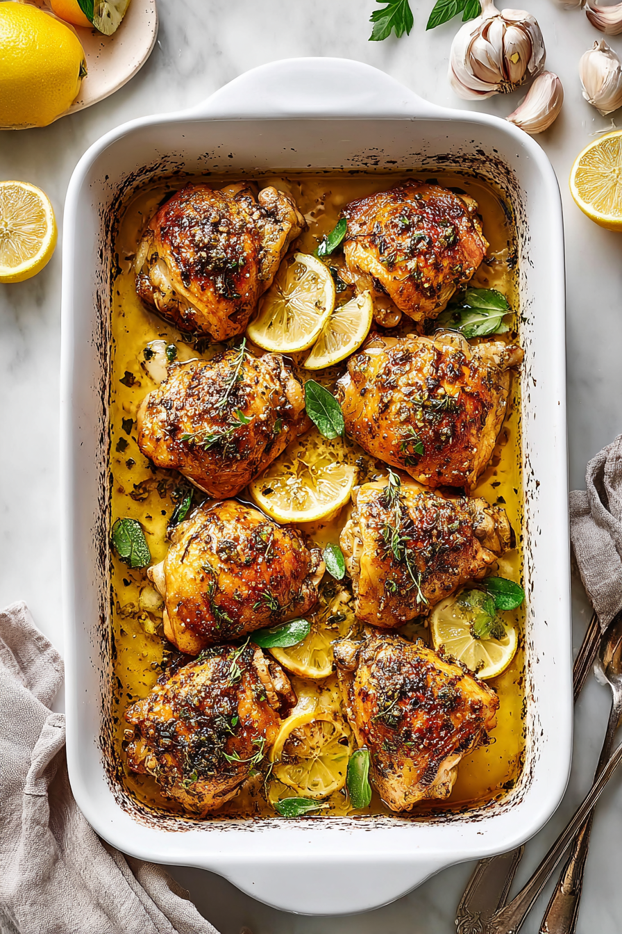 As it bakes, the kitchen fills with the aroma of citrus, garlic, and herbs, and the chicken emerges tender, golden, and deeply flavorful.
