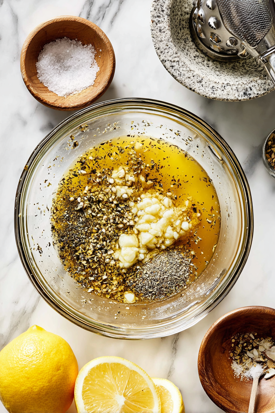 - Lemon Juice – Brings bright, fresh acidity that balances the richness of the chicken and olive oil.